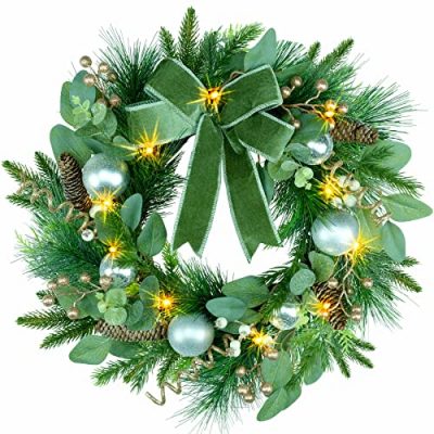 Decorate your home with the warmth and cheer of the holiday season using the YULETIME 20" Pre-Lit Christmas Wreath. This classic Christmas decoration features a wreath in 20 inches diameter. It is adorned with a green bow, silver baubles, pine cones, white mistletoe, golden berries, eucalyptus leaves, spruce branches, pine needles, and more. The wreath is battery-operated, with a strand of 10 warm white LED fairy lights, powered by three AAA batteries. Hang it on your door, window, or entrance to add a festive touch to your home. The YULETIME Pre-Lit Christmas Wreath is easy to assemble and guaranteed to bring holiday joy to your space.