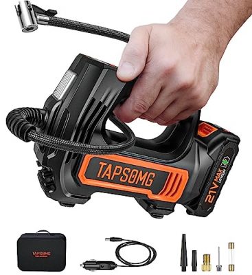 The TAPSOMG tire inflator portable air compressor is a powerful and convenient solution for all your inflation needs. With a built-in 10000mAh battery and 21V power, it offers fast inflation and can fill tires in just 3 minutes. The inflator features real-time pressure measuring and an auto-stop function for precise and reliable inflation. It is multi-purpose and comes with adapters for inflating cars, bicycles, motorcycles, balls, and swimming rings. The compact and portable design makes it easy to carry and store. With a durable construction and dual power options, this tire inflator is a trustworthy companion for emergencies. Score: 8.5/10
