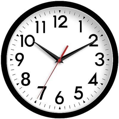 The Bernhard Products Black Wall Clock is a silent, non-ticking 10-inch clock with easy-to-read black bold numbers against a white face background. Its precise quartz movement ensures accurate timekeeping. The clock features a sturdy plastic frame and a glass lens, making it easy to clean and keeping dust away from the dial. It is the perfect wall clock for offices, classrooms, bedrooms, bathrooms, shops, gyms, and any room in your home or business. The clock is lightweight and easy to hang, and it is powered by 1 "AA" battery (not included). It comes with a 12-month manufacturer warranty.