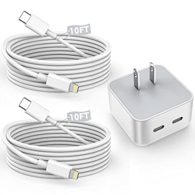 The 10FT iPhone Charger Fast Charging is a convenient and efficient charging solution for your iPhone and iPad. With its dual 20W USB-C ports, it can charge two devices simultaneously at 3 times the speed of the original 5w iPhone charger. The 10-foot long charging cable is made of high-quality copper, ensuring safe and fast charging. It is also compatible with iPhone fast chargers and computers, making it a versatile option for charging and transferring data. The charger is compact and features a built-in multi-protection system to prevent over-voltage, over-charge, and over-heat. With its long cable and small size, it is perfect for travel. Get the 10FT iPhone Charger Fast Charging for fast and reliable charging on the go.
