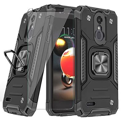 The Asuwish Compatible with LG Aristo 2 3 Plus/Rebel 4 LTE/Tribute Empire Dynasty/Zone 4/K8 Plus 2018 K8S Case and Tempered Glass Screen Protector Ring Holder Phone Cases is designed specifically for LG Aristo models. It includes a 360° rotating ring holder for easy video calls and hands-free media viewing. The dual-layer design with shockproof airbags provides effective protection against drops and shocks. The phone case also comes with a tempered glass screen protector and is compatible with magnetic car mounts. However, it does not support wireless charging. The case is available in black.