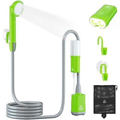 The DEERFAMY Portable Camping Shower is a convenient and powerful outdoor camp pump that is perfect for camping, beach trips, and gardening. Its compact and lightweight design makes it easy to carry, weighing only 1.82 lbs. The battery has a capacity of 4400mAh and can last up to 90 minutes, providing a reliable and consistent water flow rate of 0.71-0.79 gal/min. The shower head is easy to control, and the added lighting device provides safety for nighttime showers. With a two-year warranty and lifetime customer service, DEERFAMY promises a zero-risk purchase. Overall, this portable camping shower offers great value for its features and is a must-have for outdoor enthusiasts.