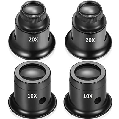 The 4 Pieces Jewlers Loupe Portable Monocular Loupe Jewelers Eye Magnifier Loupe Repairs Tool Watchmaker Loupe Magnifying Glass Set Lens Repair Kit is a handy set of magnifiers designed for various detailed inspections. The eyeglass loupes feature a double layers glass lens, providing clear magnification and allowing for easy observation of subtle details. With 10X and 20X magnifications available, you can choose the appropriate magnifier for different situations. These small-sized magnifiers are convenient to carry for outdoor use or travel. They are not only ideal for examining jewelry, gems, coins, stamps, and antiques, but can also be used as scientific tools to enhance children's interest in nature. Overall, this set of jeweler's loupes is a versatile and practical tool for professionals and hobbyists alike.