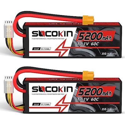 The SOCOKIN 11.1V Lipo Battery is a high-quality lithium polymer battery designed for RC vehicles and airplanes. With a capacity of 5200mAh and a discharge rate of 60C, this battery provides excellent endurance power and high-speed charging. It comes with a hard case and an XT60 plug for easy installation. The battery is compatible with various RC cars, trucks, buggies, and boats, making it versatile for different models. The dimensions of the battery are 5.47Lx1.85Wx1.42H inches, and it weighs 383g/13.5oz. Users have praised the battery's construction, longevity, and compatibility with other brands. However, some have noted that the claimed 60C rating may not be entirely accurate. Overall, the SOCOKIN 11.1V Lipo Battery is a reliable performer at an affordable price.