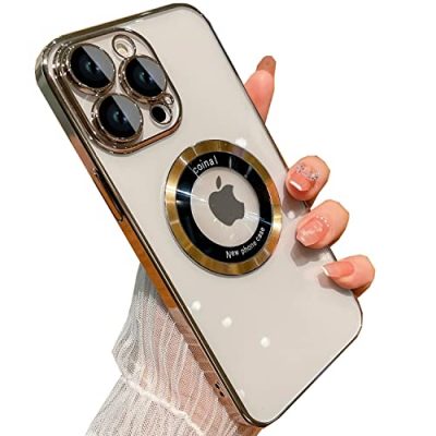 The LOOBIVAL iPhone 14 Pro Max Case is a luxury phone case designed for iPhone 14 Pro Max. It is made of hard PC material and is compatible with Magsafe. The case is slim and ultrathin, allowing for wireless charging. It features a transparent design with a plating bumper and glass lens protector. The style is business, simple, and luxurious, making it suitable for all kinds of occasions. It is a great gift for both men and women. The case is available in gold color.