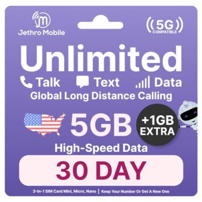 Stay connected from anywhere in the US with Jethro Mobile's prepaid SIM card. Enjoy unlimited talk, text, and 5GB of high-speed data for 30 days. The SIM card is compatible with 5G/4G LTE phones, and you can easily activate it online or by phone. With international calling to Canada, Mexico, India, China, and more countries, you can always stay in touch with distant friends and family. Jethro Mobile also offers live customer support seven days a week, ensuring you have assistance whenever you need it.