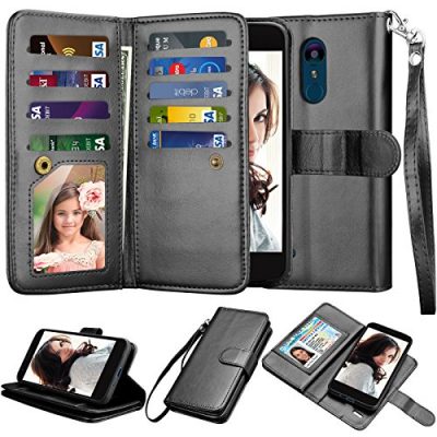 The NJJEX Compatible with LG Aristo 2/Aristo 3/Phoenix 4/Rebel 4 LTE/Tribute Empire/Dynasty/Zone 4/Fortune 2/Rebel 3 LTE/Risio 3/K8 Wallet Case is a 2-in-1 hybrid wallet case and slim case designed specifically for LG Aristo 2 and other compatible LG models. It is made of high-quality PU leather and features 9 card slots, a money pocket, and a kickstand for hands-free viewing. The precise cutouts provide full access to ports, and the included magnetic clip allows for quick fastening and access. With its stylish design and functional features, this wallet case offers complete protection and convenience. The case is available in black and has dimensions of 5.50Lx3.00Wx0.60H. Customer ratings for this product average at 4.4/5.
