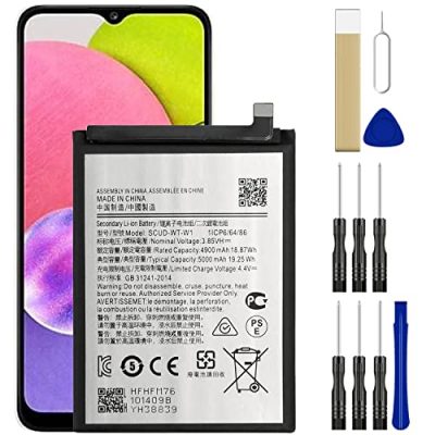 Revive your Samsung Galaxy A03s or A22 5G with the DDONG PLUS Scud-WT-W1 Replacement Battery. This battery, complete with tool kits, is durable, safe, and reliable, making it a suitable replacement for your original battery. It is manufactured with premium grade A++ battery cells and features a high quality aluminum casing and smart IC chip. With over 800+ charge cycles, this battery promises a long lifespan. The package includes the battery and adhesive tool kits. Please note that the battery may be shipped with little or no power, so it is recommended to fully charge it before use. Contact customer service for any assistance or issues.