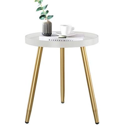 The Round Side Table is a versatile and stylish addition to any room. With its minimalist design and sturdy construction, this table can be used as a tea table, end table, coffee table, bedside table, plant stand, or outdoor table. The easy assembly process makes it convenient to set up in just 1 minute, without the need for tools. The table features a waterproof and easy-to-clean surface, along with edge protection and foot pads to prevent scratching the floor. Its durable and sturdy structure, with gold triangular table legs and a thick board, ensures long-lasting use. The table's dimensions are 15" L x 15" W x 18" H, and it comes in a white color with gold legs.