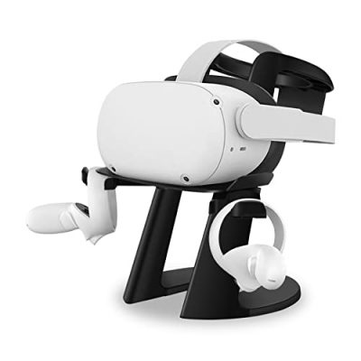 Organize and display your VR headsets and controllers with the AMVR Compatible with Quest 2 Stand. This upgraded, heavier stand provides a stable base for your Quest 2, Quest 1, Rift, or Rift S headset and touch controllers. With easy assembly and compatibility with most standard-sized VR headsets and touch controllers, this stand is a convenient accessory for VR enthusiasts. The black finish adds a sleek and modern touch to your desktop setup. Keep your VR equipment safe, neat, and impress your friends with the AMVR Compatible with Quest 2 Stand.