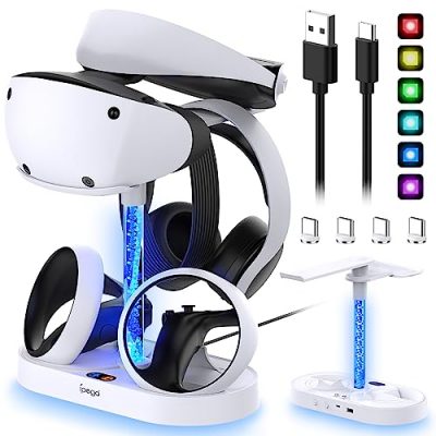 The VR2 Charging & Storage Stand from MENEEA is a multi-functional charging station designed specifically for PSVR2. Not only does it charge your PSVR2 controller, but it also provides a display and storage area for your VR headset and PS5 headphones. The stand features fast charging, with the ability to fully charge the touch controller within 1.5 hours. It includes a colorful RGB light column that can be customized with 7 different colors and effects. The stand also has a 2.0 USB port for data transmission. Overall, this all-in-one set is a convenient solution for keeping your PSVR2 accessories organized and charged. The stand has received a customer rating of 4.2 out of 5.