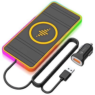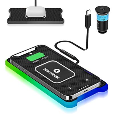 The Wireless Charging Pad Car REESTECQI 15W RGB Wireless Charger for Car Type C Non Slip Wireless Car Charger Mat is a cool and fun way to charge your device. With fast charging up to 15W and universal compatibility, it can charge various devices such as AirPods, iPhones, and Samsung phones. The charger is designed with 26 RGB LED lights that create an immersive charging experience. The non-slip material ensures that your phone stays in place even on bumpy roads. This wireless charger also features advanced safety measures to prevent overheating and comes with a 30cm cable for convenient charging. Overall, it offers a secure, vibrant, and convenient charging solution for your car.