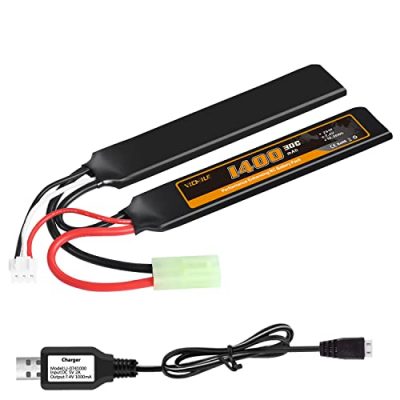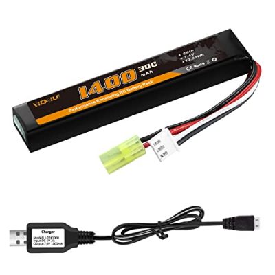 The VICMILE Airsoft Battery is a high-performance rechargeable 2S Lipo battery designed for airsoft model guns. With a capacity of 1400mAh and a voltage of 7.4V, this battery delivers a powerful discharge rate of 30C, providing increased firepower and rapid trigger response time. Its compact size and Tamiya plug make it compatible with most popular airsoft model guns. The battery has a long cycle life and offers super safety features, with no memory effect and quick, constant charging. Included with the battery is a 7.4V USB Battery Charger. With positive customer reviews and a rating of 4.4/5, the VICMILE Airsoft Battery offers reliable performance and comes with a one-year warranty.