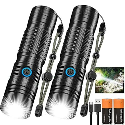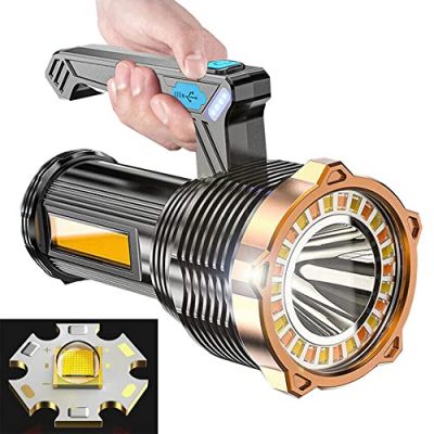 The Goreit Flashlights High Lumens Rechargeable is a powerful handheld flashlight designed for emergencies and outdoor activities. With a maximum output of 200,000 lumens, it is 10 times brighter than a normal LED flashlight, allowing it to illuminate over the length of about 2.5 football fields. The flashlight features a newly upgraded XHP70.2 LED chip, providing stability and super brightness. Its rechargeable battery offers a working time of up to 10 hours on low mode, and the flashlight can also be used to charge other electronic devices through its USB output. Built to withstand rough handling, this IP67 waterproof flashlight is practically indestructible, surviving a 10-foot drop or temporary submersion. It comes with five light modes, an adjustable focus, and is made of aerospace-grade aluminum alloy. Overall, the Goreit Flashlights High Lumens Rechargeable offers excellent performance and durability at an affordable price.