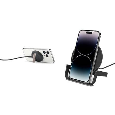 The Belkin Wireless Charger provides fast charging up to 15W, making it compatible with the Apple iPhone 14, 13, and 12 Series, as well as Qi-enabled devices. It is also MAGSAFE COMPATIBLE for use with certified MagSafe Cases. The charger stand features an integrated metal pop-up kickstand and an extra-long 6.6ft braided cable, allowing you to use your iPhone while it charges. With durable materials and certified over-voltage protection, this wireless charger is built to last. Additionally, the Belkin Wireless Charging Speaker offers interruption-free wireless charging with up to 10W of fast charging. Its phone stand design and integrated LED lights make it convenient and easy to use. Both products provide protection and power for worry-free charging.