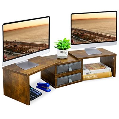 The MARTY Dual Monitor Stand Riser is a versatile and multifunctional desktop stand that provides adjustable height, length, and angle options. It can be used as a dual monitor stand with two tiers, a triple monitor stand with one tier, or two monitor stand shelves. The stand comes with 2 large capacity drawers and 2 additional storage spaces, offering ample storage for office accessories. Made of high-quality thicken board, this computer riser is sturdy and stable, supporting up to 80lbs. It is easy to assemble and provides a comfortable and effective work environment. With its rustic brown color, this monitor riser adds a touch of elegance to any desk.