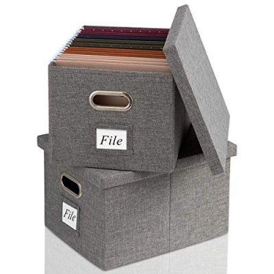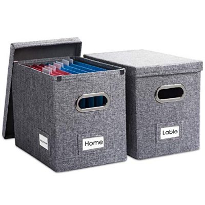 The PRANDOM File Organizer Box is a stylish and functional solution for organizing your paperwork, letters, folders, and hanging files. This set of 2 collapsible file cabinets is made from grey linen and features a decorative design. The storage containers can easily collapse down for convenient storage when not in use. They can be used for a variety of purposes, including document organization, tax paperwork, storing children's art work, and other office or home storage needs. The file boxes have labels on both sides, allowing for versatile file storage. With a 3-year warranty and a longer life span than cheap bins, these file organizers offer a reliable and durable solution.