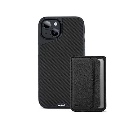 Introducing the MOUS MagSafe Card Holder Wallet and iPhone 14 Case Carbon Fiber Limitless 5.0, a versatile accessory combo that provides convenience, style, and protection for your iPhone 14. The MagSafe compatible wallet is crafted from 100% real leather, offering a refined look and durability. It features two slots to securely store your cards and cash, while the phone case delivers ultra-protection with AiroShock impact absorbing technology. The strong magnetic MagSafe connection ensures a secure attachment between the phone case and wallet, complemented by more than 100 minute silicone dots for slip-resistance. With magnetic shielding, your card's magnetic strip remains unaffected. Plus, you can enjoy peace of mind with the included lifetime warranty that covers all Mous cases, accessories, and screen protectors.