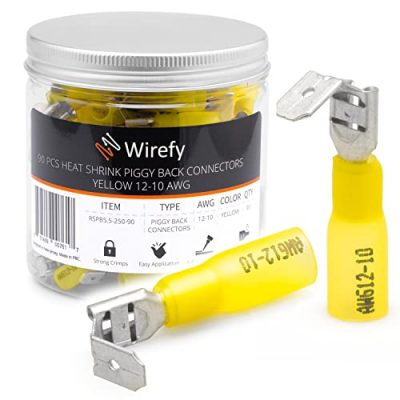 The Wirefy 90 PCS Heat Shrink Piggyback Spade Connectors are a versatile and reliable option for split connections. With marine-grade heat shrink tubing that shrinks down to seal the connection, these connectors are built to withstand the elements. The double crimp barrels ensure strong crimps, preventing wires from slipping out. These connectors are also quick disconnects, making them ideal for wiring components that need to be frequently disconnected and reconnected. Backed by a lifetime warranty, Wirefy guarantees the quality of their electrical connectors. The Yellow 12-10 AWG size is perfect for a variety of applications. Overall, these connectors are a high-quality option with good performance.