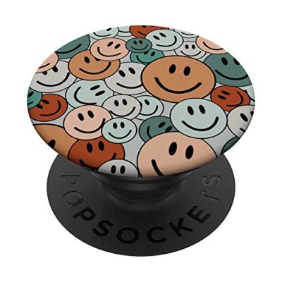 The indie pastel pretty aesthetic cute trippy swirl smile face PopSockets Swappable PopGrip is a trendy pink melted smile face design that is perfect for fans of kidcore colorful smile faces and trippy psychedelic patterns. This cute and happy aesthetic accessory features a collage of smiling faces and is great for both men and women. The PopGrip is swappable, allowing you to switch out the top for different designs or remove it completely for wireless charging. It also includes an expandable stand for hands-free viewing and a special adhesive that can be removed and repositioned on most devices and cases. However, it may not stick well to silicone, waterproof, or textured cases. Overall, customers have given it a high rating for its cuteness and functionality.