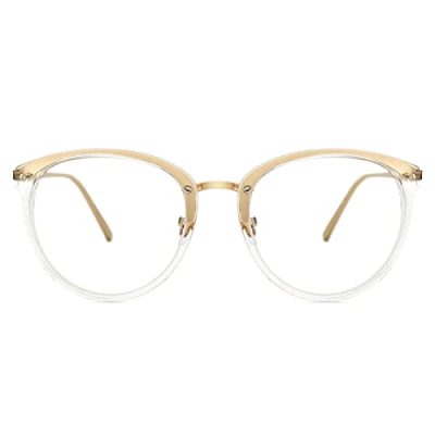 The TIJN Blue Light Blocking Vintage Round Metal Optical Eyewear Clear Eyeglasses Frame for Women is a stylish and functional eyewear option designed to protect your eyes from blue light. These non-prescription round glasses feature plastic demo lenses that can be easily replaced with prescription lenses if needed. The frame is made from high-quality materials and is available in a sleek gold fade color. With a comfortable fit and spring hinges, these glasses are designed to stay in place and provide a secure and comfortable wearing experience. The glasses have received positive reviews from customers who appreciate their effectiveness in blocking blue light and their fashionable design.