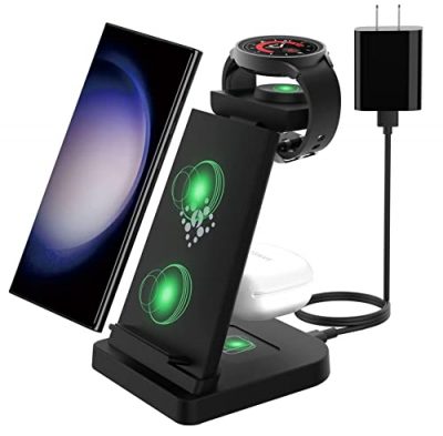 The Wireless Charger Stand Charging Station is a convenient and efficient way to charge your Samsung Galaxy devices. It is compatible with various Samsung models including Galaxy S23, S22, S21, S20, Note20, and the Galaxy Watch series. The charging station features a compact design with a T-plate and silicone pads to protect your devices from scratches and sliding. It also has a built-in magnet for easy alignment of your Galaxy Watch. The charger is Qi-certified and comes with safety features to prevent over-charging and damage to your devices. It includes a Type-C power cable, QC 3.0 AC Adapter, and user guide. With its multiple charging capabilities and compact size, this wireless charger stand is a great option for home, office, and travel.