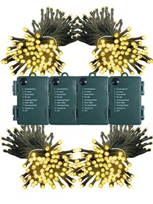 The 4 Pack Each 16.4ft 60 LED Battery Operated Christmas Tree Lights are a versatile and festive decoration for both indoor and outdoor use. These warm white fairy lights feature a dark green wire and come in a pack of 4, each 16.4ft long with 60 LEDs. With 8.3cm between each bulb, these lights provide high density and brightness. They are powered by 3 x AA batteries (not included) and offer 8 variable light modes. These lights also have a timer function, automatically turning on for 6 hours and off for 18 hours. The waterproof design makes them suitable for various weather conditions. Ideal for Christmas trees, gardens, patios, and more, these battery operated lights add a festive touch to any space.