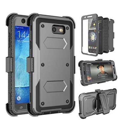 The Galaxy J7 2017 / J7 V /J7 Perx / J7 Prime / J7 Sky Pro/Galaxy Halo Holsters Clips Case by Jeylly is a heavy-duty, shockproof case designed to perfectly fit the Samsung Galaxy J7 2017. It is compatible with various carriers and offers full body protection for your phone. The case features a built-in belt clip that rotates 180 degrees for convenient carrying, as well as a locking kickstand for hands-free viewing. With its 3-in-1 combo design, it provides both hard outer shell and soft inner lining to absorb shocks and protect your phone from damage. The case also has a raised lip for screen protection and full access to all phone features. Overall, it is a well-made and affordable option for those in need of a durable phone case.