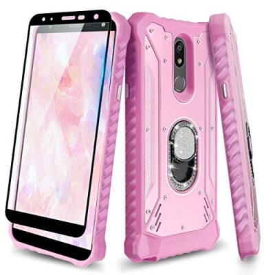 The TJS Phone Case is a stylish and protective accessory compatible with several LG phone models. It features a dual-layer design with shockproof TPU and solid PC materials for enhanced protection against bumps and falls. The case also includes a 360-degree rotating ring holder that doubles as a kickstand for hands-free viewing. In addition, it has a steel plate in the center for magnetic car mount functionality. The case is made of flexible TPU that absorbs shocks and has a raised lip to protect the screen. With its pink color and full coverage tempered glass screen protector, this case offers both style and functionality for LG phone users.