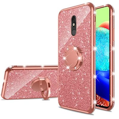 The LG K40 Phone Case is a glittery silicone TPU cover designed for girls and women. It is compatible with several LG models, including K40, K12 Plus, K12 Pro, X4 2019, Solo LTE, Harmony 3, and Xpression Plus 2. The case features a luxuriously shiny design with inlaid artificial rhinestone diamonds and sparkles that won't smudge. It also comes with a unique ring kickstand that allows for 360-degree rotation and 180-degree folding to provide hands-free use. The case is ultra-slim and has precision cutouts for all ports, ensuring maximum functionality. With its pretty and luxury look, it makes for a great gift for girls, women, and family members. The case has received positive reviews for its good quality and aesthetic appeal.
