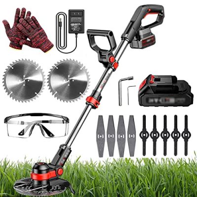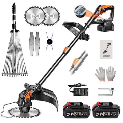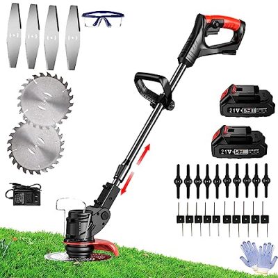 The Battery Operated Weed Eater is a powerful and lightweight tool that combines a trimmer and edger. It features an 880W high-power pure copper motor, up to 18000 RPM no-load speed, and a 3000mAh lithium battery that provides up to 60 minutes of uninterrupted operation. The weed eater comes with five blade types for various tasks, adjustable cutting angle and height, and two removable and rechargeable 3000mAh batteries. It is easy to handle, weighing only 3.9Ibs, and can reach areas that a mower cannot. With its large capacity battery packs and versatile blades, this cordless weed wacker is designed to keep your lawn neat and tidy.