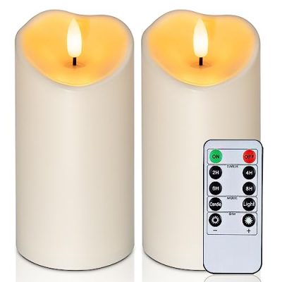 The Homemory 6” x 3” Outdoor Waterproof Flameless Candles are a perfect addition to your indoor or outdoor space. These flickering LED pillar candles are designed with a waterproof feature, making them more realistic and reliable without worrying about melting or rain. The candles have a 3D wick and a waterproof treatment on the top and base, simulating rainwater flowing from top to bottom. They come in an ivory plastic shell that becomes transparent when the light is on. With the convenient remote control, you can easily set timers or adjust the light modes and brightness. These battery-operated candles provide all the benefits of traditional candles without the negatives, such as no dripping-hot wax or smoke. Each set includes 2 outdoor candles, a remote control, and user manual. Enjoy the ambiance of these waterproof fake plastic candles with a customer rating of 4.6/5.