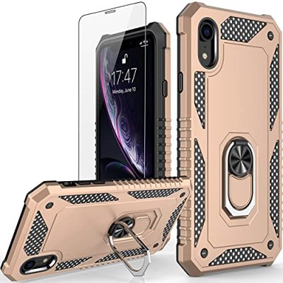 The CCKO iPhone XR Case with Screen Protector is a shock-proof cover that offers rugged protection for your Apple iPhone XR. With a thin and lightweight design, this phone case is wireless charging friendly, allowing you to charge your phone without removing the case. It features an anti-slip design with raised edges for a secure grip and easy installation. The built-in 360-degree rotatable kickstand provides hands-free viewing, and there is a hidden iron in the ring for use with a magnetic car mount holder. This protective phone case has been military-grade drop tested and uses Impact Dispersion Technology to absorb shocks and protect against drops and scratches. With its gold color and durable construction, this case is a practical choice for daily use and outdoor activities.