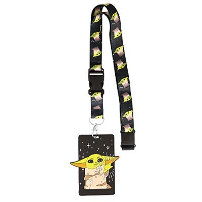 Carry your ID, keys, or badge with the power of the force. This Star Wars lanyard is decorated with a fun Baby Yoda print and a black background. It has a lobster claw clip and Baby Yoda ID and badge holder. The neck lanyard includes a breakaway feature for added convenience. Made with high-quality polyester fabric, this lanyard is durable and comfortable to wear all day. The Baby Yoda badge holder can accommodate standard-sized ID cards. It is a great gift for fans of Star Wars and Baby Yoda. Overall, this lanyard combines style, functionality, and fandom for an enjoyable everyday accessory.