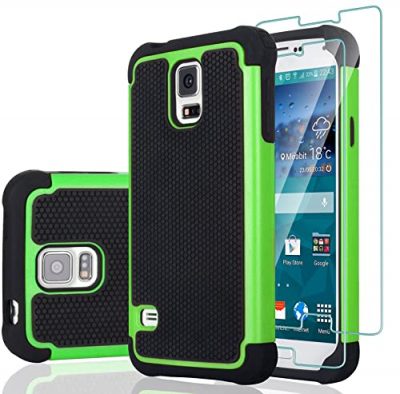 The GAMEMIUZ Galaxy S5 Case is a protective dual-layer hybrid case designed for the Samsung Galaxy S5. It comes with two tempered glass screen protectors for full protection. The reinforced corners increase shock absorption, while the rubberized polycarbonate armor outer case and silicone inner layer shield your phone from damage. The case features an ergonomic grip for a secure and comfortable hold and provides full access to all phone features. With a raised lip for screen protection, it prevents the screen from touching flat surfaces directly. The case is compatible with various carriers and comes with a 1-year warranty. Available in green.