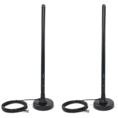 Boost signal strength and data speeds on various cellular networks with the Proxicast 6.5~8 dBi Gain External Magnetic Loaded Coil Antenna. This high-gain antenna offers a longer range and enhanced throughput compared to low-gain antennas included with many cellular products. Its flexible positioning allows for maximum signal reception, making it suitable for a range of applications such as vending machines, ATMs, kiosks, M2M, IOT, or desktop use. It is compatible with any 3G/4G/LTE router, modem, or hotspot with a TS9 antenna jack. The package includes two 6.5~8 dBi omni-directional loaded coil whip antennas, a magnetic mounting base, a 10 ft coax cable, and a TS9 male connector. Please note that it is not intended for exterior vehicle use.