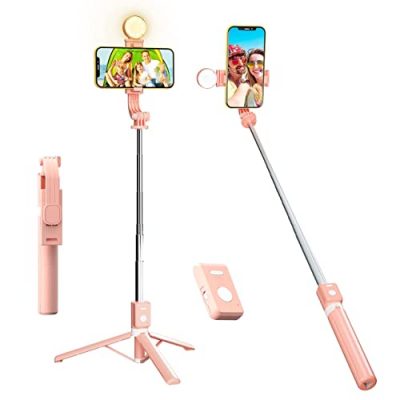The Selfie Stick Tripod with Remote and Light is a versatile mobile accessory that allows users to take perfect selfies and group photos. This telescopic folding selfie stick can be extended up to 43 inches and folds down to a compact size of 9.4 inches, making it incredibly portable. It features a detachable Bluetooth remote control that can operate the mobile phone from up to 10 meters away. With 360-degree rotation capabilities, users can capture photos from various angles, and the bracket arm supports more than 180 degrees of rotation for added flexibility. The selfie stick tripod is compatible with both Android and iOS devices, including popular models like the iPhone 14/13/12/11 Pro Max and Samsung Galaxy S22 S21.