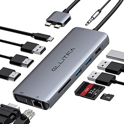 The GLLITRA 12-in-2 USB C Hub is a portable docking station designed specifically for MacBook Pro/Air users. It features 2 4K HDMI video outputs, VGA, Ethernet RJ-45 ports, 3.5mm Audio/Mic, 2 x USB 3.0, 2x USB 2.0, PD3.0 ports, and an SD/TF card reader slot. With advanced chip technology, this hub meets all your multi-scenario needs. It supports crystal-clear 4K video and dual-screen and three-screen display modes. The PD3.0 interface allows for efficient power supply, and the gigabit Ethernet port ensures a stable network connection. The hub also offers instant data transmission with USB 3.0 ports and a built-in SD&TF card reader. Its lightweight design and space gray color perfectly complement the MacBook.