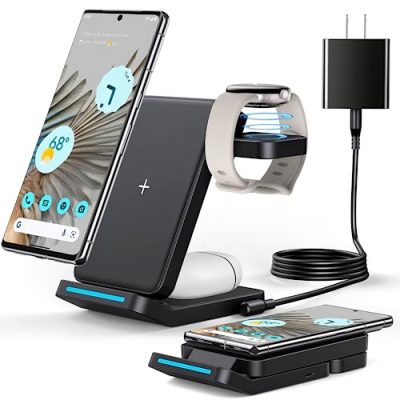 The MIUOLV 4 in 1 Foldable Wireless Charging Station is specifically designed for Google Pixel devices. It allows for simultaneous charging of Google Pixel phones, Google Pixel Watch, Google Pixel Buds Pro, and Pixel Buds A Series. The charger comes with a magnetic Google Pixel Watch charger and a QC 3.0 adapter for fast and safe charging. Its foldable design makes it lightweight and portable, perfect for travel. The charger is case-friendly and has a non-slip silicone design for added stability. With its 4-in-1 features, it serves as a convenient desktop or bedside organizer. Overall, the MIUOLV 4 in 1 Foldable Wireless Charging Station offers a safe and efficient charging solution for multiple Google Pixel devices.