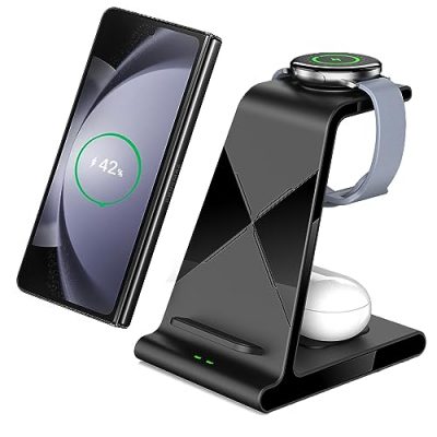 The Wireless Charger for Samsung Galaxy S23 Ultra/Z Fold 5/Flip Z 5 is a 3-in-1 wireless charging station designed specifically for Samsung devices. It is compatible with Samsung Galaxy Watch, Galaxy Buds, and Samsung wireless-charging-enabled phones. The charger features optimized wireless charging output, providing fast and efficient charging for all your Samsung devices. It also offers power protection and is easy to use. The charger is universally compatible with other wireless-charging-enabled phones as well. With its sleek design and convenience, it makes for a great Father's Day gift. The charger comes with a charger, Type-C cable, adapter, and user manual. Overall, it received positive reviews with a customer rating of 4.2/5.