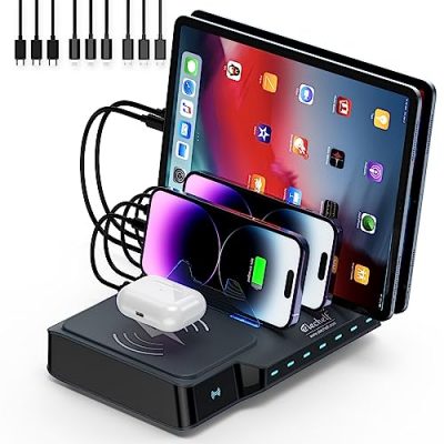The Charging Station for Multiple Devices Elechelf is a versatile charging station equipped with 7 USB ports and 1 wireless charger, allowing you to charge up to 8 devices simultaneously. It offers fast charging with up to 5V/2.4A for each port, and it comes with 9 charging cables that are compatible with Apple and Android devices. The station is designed to keep your desktop organized and clutter-free, and it is made with high-quality materials. It also has CE certification for safety. With its simple and convenient design, the Charging Station for Multiple Devices Elechelf is a great solution for charging multiple devices at once.