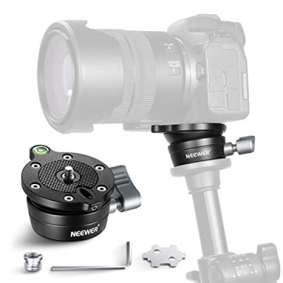 The NEEWER Tripod Leveling Base is a versatile camera leveler that offers stability and flexible shooting angles. Its tilting design allows for 12° up and down tilt, while the 360° panning movement ensures smooth and accurate leveling. The built-in bubble level helps align the camera with the horizontal line effortlessly, and the sturdy construction of CNC-machined aluminum alloy ensures durability. With a load capacity of up to 11lb / 5kg, it is perfect for outdoor photography. The 1/4” mounting screw is compatible with Canon Nikon Sony DSLR cameras, mirrorless cameras, and camcorders. The tripod leveling base also features convertible threads to work with a wide range of light stands and tripods. Overall, it is a convenient and reliable tool for leveling your camera setup.