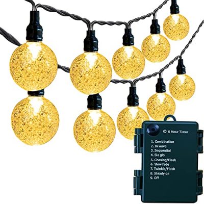 The Battery Operated Globe String Lights are a premium quality LED string lights that are powered by 3*AA batteries (not included). These portable crystal ball string lights can be used for indoor and outdoor decoration, transforming your gazebo or porch into a retreat. With 8 lighting modes and a built-in timer function, these lights offer diverse options and energy-saving convenience. The commercial grade weatherproof LED bulbs and heavy-duty strand make them durable, even in harsh weather conditions. Whether for weddings, parties, or everyday ambience, these decorative LED string lights create a great atmosphere. Backed by a 1-year warranty, the lights are safe to touch, long-lasting, and come with a satisfaction guarantee.