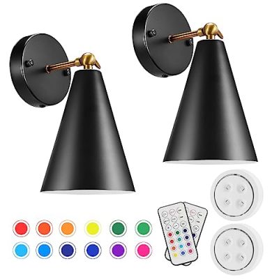Enhance the ambiance of your indoor spaces with the Battery Operated Wall Sconce. This set of two wireless wall lights features a simple and elegant design, with a brass lamp head and black lamp body, bringing together industrial and modern styles. The light is easily adjustable with the wireless remote control, allowing you to set switches, adjust brightness, choose lighting modes, and even set a timer. With 13 RGB colors to choose from, you can create the perfect atmosphere for any occasion. Whether it's for your bedroom, living room, hallway, or any indoor area, these battery-powered wall lights provide a versatile and convenient lighting solution.