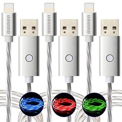 Upgrade your charging experience with the momen LED iPhone Charger Cable. This pack includes three 6ft lighting cables in vibrant blue, green, and red colors. The cables feature an adjustable LED lighting mode with options like Downflow, Counter flow, Smooth, Stroboflash, and Breathe. With bold copper wire core and silver-plated USB head, these cables ensure fast charging and data syncing, delivering 20% faster charging speeds than conventional cables. The gold-plated USB head and soft TPE cover enhance durability, flexibility, and heat dissipation. The cables are compatible with various iPhone models and come with a 360-day warranty. Add a playful touch to your charging routine with these unique LED charger cables!
