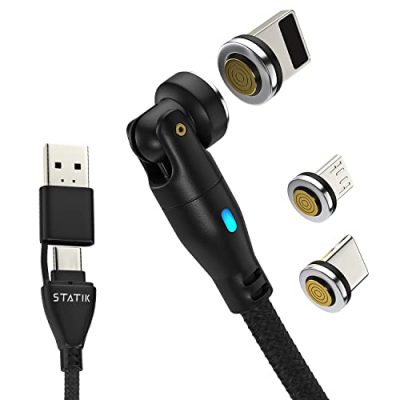 The Statik 360 Pro Magnetic Charging Cable is a versatile and powerful charging solution for all your devices. With its 100W BlitzCharge Technology, it can fast charge laptops, smartphones, tablets, drones, and more. This magnetic USB C charging cable also supports high-speed data transfer, making it perfect for music streaming and GPS navigation. It includes 3 magnetic tips (Type-C and Micro USB) and 2 adapters (USB-C and USB-A), eliminating the need for multiple cables. The cable features an upgraded magnetic connection that is twice as strong, ensuring a secure and reliable charge. Additionally, the 360-degree rotating magnetic tips protect your device's power port and save you from expensive repairs. Overall, the Statik 360 Pro is a convenient and durable charging cable that delivers on its promises.
