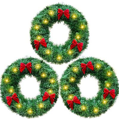 The 3 Pack Prelit Christmas Wreaths with Lights is a festive and convenient decoration for the holiday season. The package includes three 12-inch thick PVC tinsel wreaths, each pre-installed with three red bows for a touch of Christmas spirit. With the included three string lights, you can customize the wreaths by wrapping the lights around them. These battery-operated lights have three lighting modes and are powered by LR44 batteries, which are included. The wreaths can be hung anywhere using the built-in hanging hole. They are suitable for indoor and outdoor use and make ideal gifts for family and friends. However, the product has received mixed reviews, with some customers expressing disappointment in the quality and size of the wreaths.