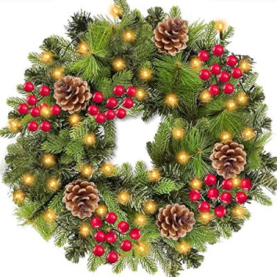 The 24 Inch 80 LED Super Thick Prelit Artificial Christmas Wreath with Lights Timer is a decent option for adding holiday charm to your home. With its realistic appearance and warm white LED lights, it creates a cozy and inviting atmosphere. The battery-operated design and built-in timer make it convenient to use. However, some customers have mentioned that the lights are not as bright as expected, and the quality may not be as high as desired for the price. Overall, if you’re looking for a festive wreath with a natural look and easy operation, this product is worth considering.
