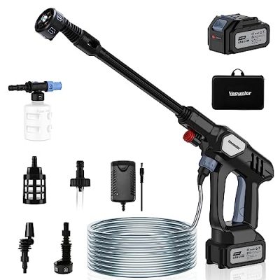 The Vagueior Cordless Pressure Washer is a powerful and convenient tool for outdoor cleaning and watering. With its 950 PSI motor, it can easily remove stubborn dirt on various surfaces. The high-capacity battery lasts for 45 minutes and is made up of 10 small batteries. The cordless design and lightweight body make it easy to carry, and the self-priming function and connecting hose allow for flexibility in water sources. The 6-in-1 nozzle provides versatility with different spraying modes, perfect for car cleaning, garden cleaning, and more. The product comes with a battery, charger, hose, extension rod, nozzles, foam kettle, filter screen, and user manual. It also comes with a 12-month warranty. Overall, the Vagueior Cordless Pressure Washer is a reliable and efficient option for outdoor cleaning needs.