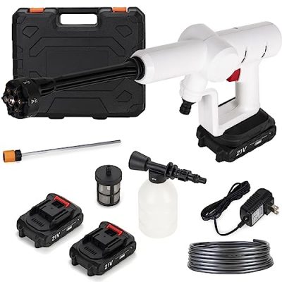 The Cordless High Pressure Washer is a portable handheld car cleaning machine that offers the convenience of wireless operation. With its powerful 435 PSI motor and 21V rechargeable Li-ion battery, it can spray water up to 3L/min and lasts for 30 minutes when fully charged. The pressure washer features an adjustable nozzle that can be set from 0-180°, allowing you to choose between spray, free jet, foam injection, and high pressure direct injection. It also includes a 16.4ft hose with a filter basket, making it easy to draw water from anywhere. The compact and lightweight design makes it perfect for various household and DIY projects. The kit comes with everything you need, including a charger, extender, foam spraying nozzle, and more. Overall, this cordless power cleaner is a versatile and efficient solution for washing cars, fences, patios, furniture, and more.